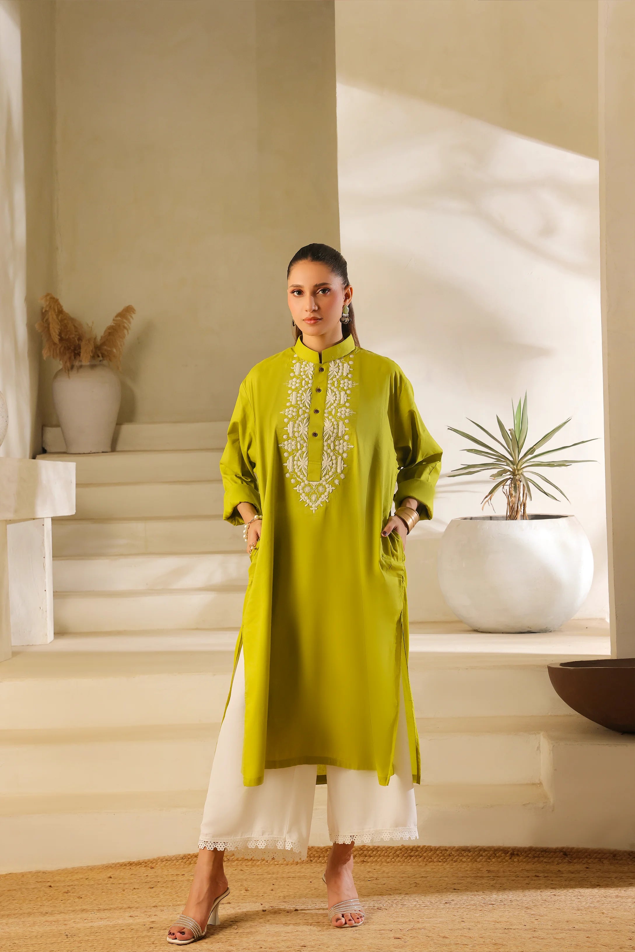 Crafted from pure cotton mul fabric, this breezy olive green kurta features elegant white embroidery and a row of buttons along the neckline. A timeless staple, it’s designed to bring refined simplicity to your everyday wardrobe—cool, breathable, and effortlessly chic.