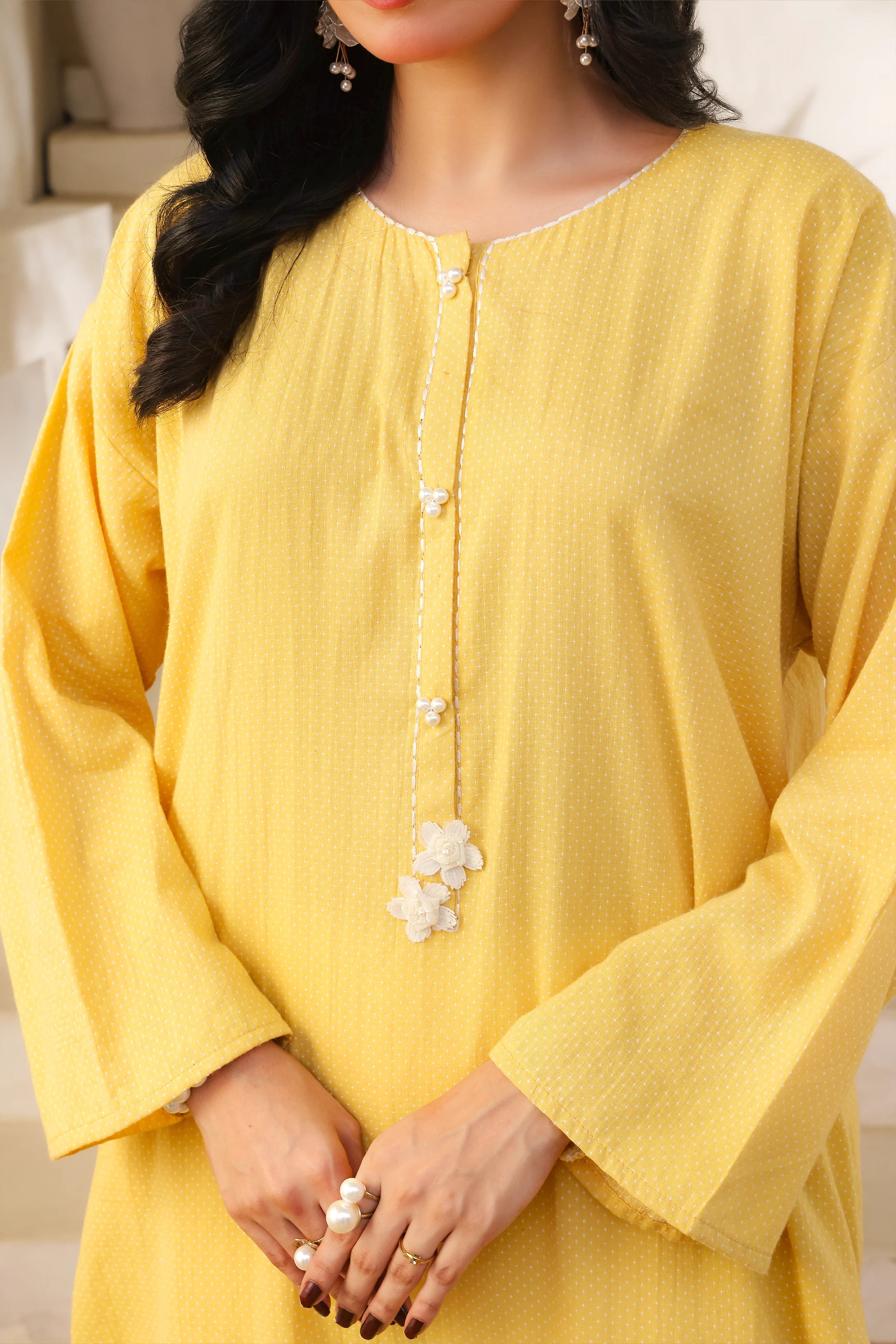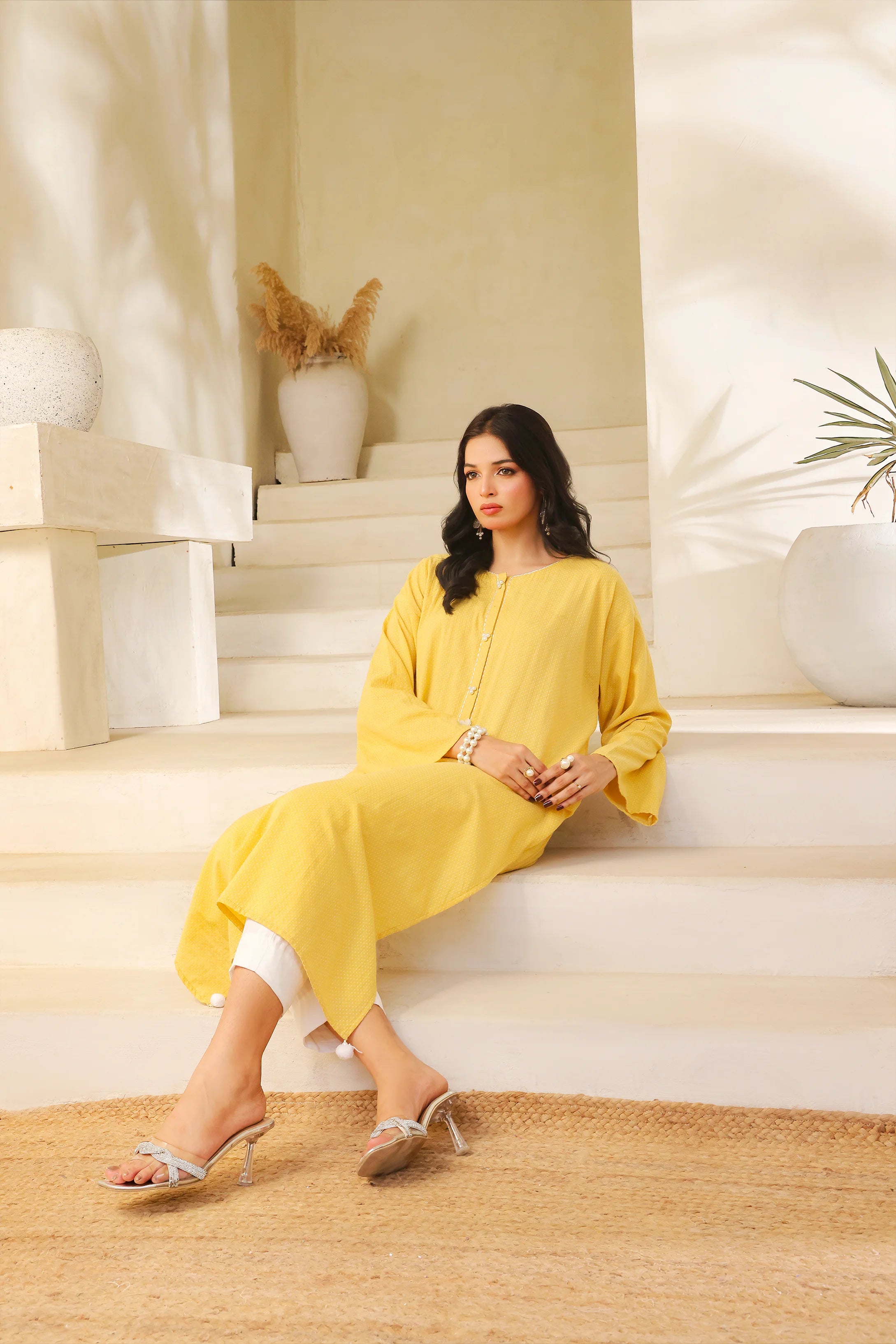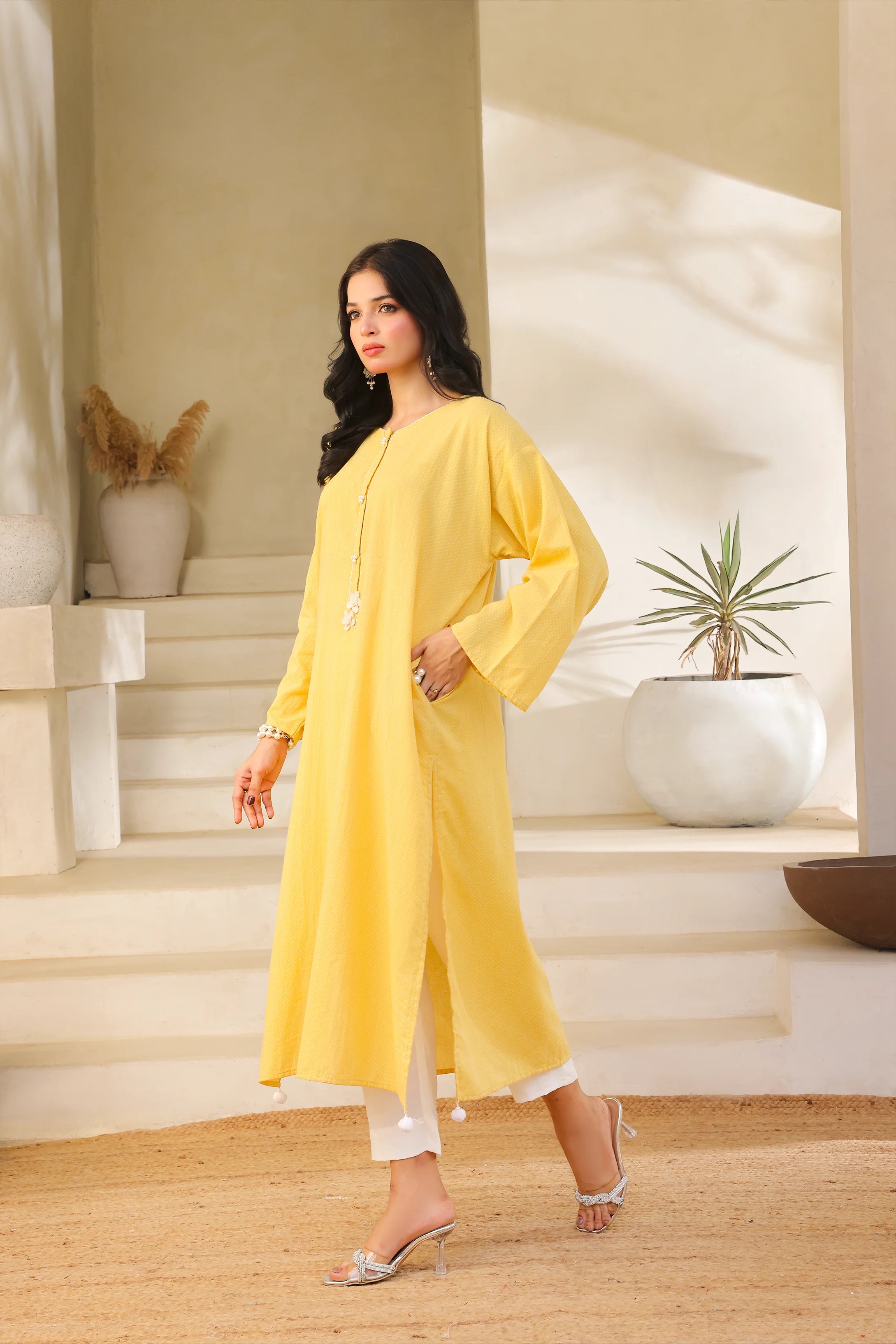 Minimalism meets craftsmanship in this self cotton Light-Yellow kurta, detailed with pearl buttons on the patti and finished with handmade tassels for an artisanal touch. Lightweight and graceful, it’s a statement in understated elegance—ideal for days when ease and beauty go hand in hand.