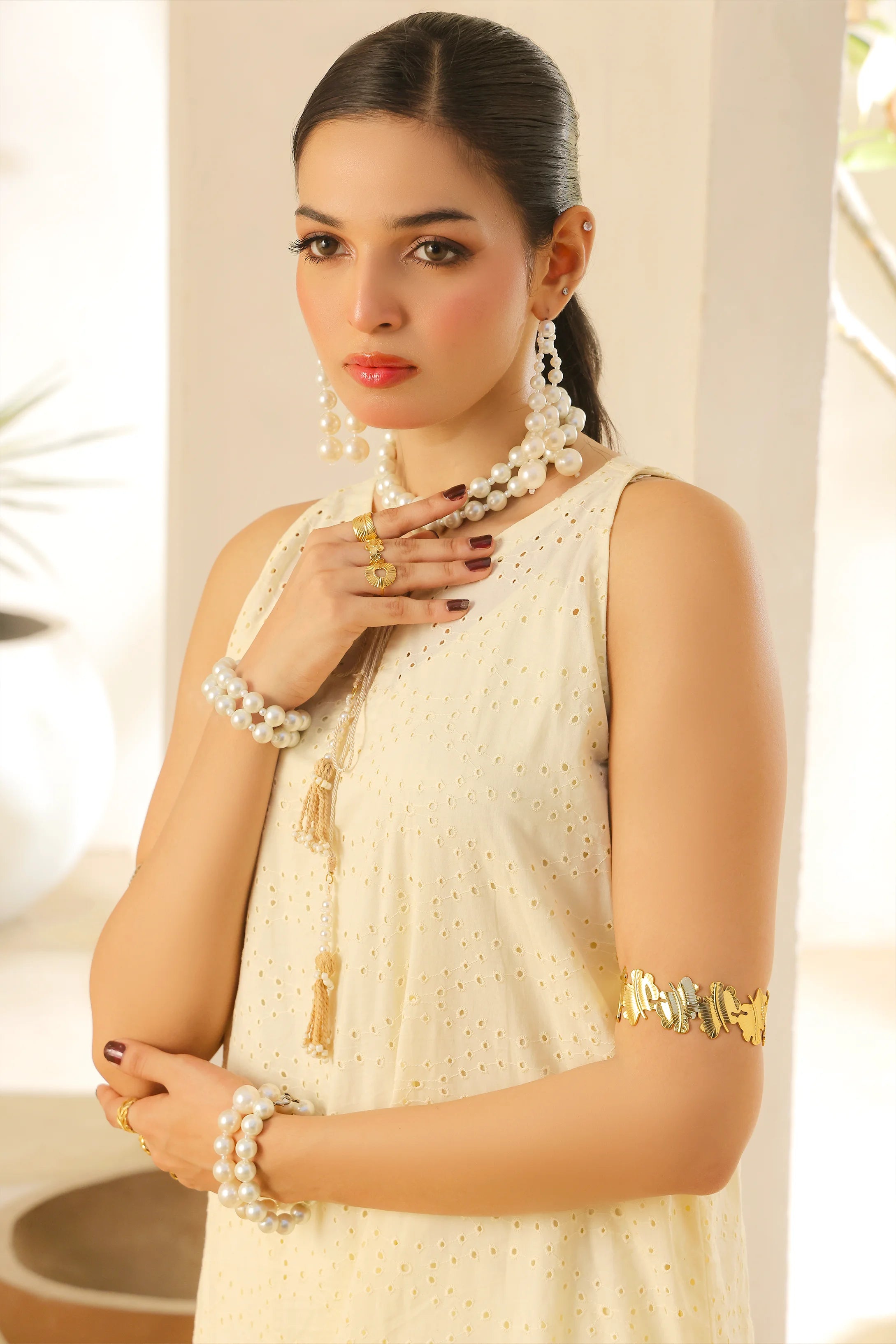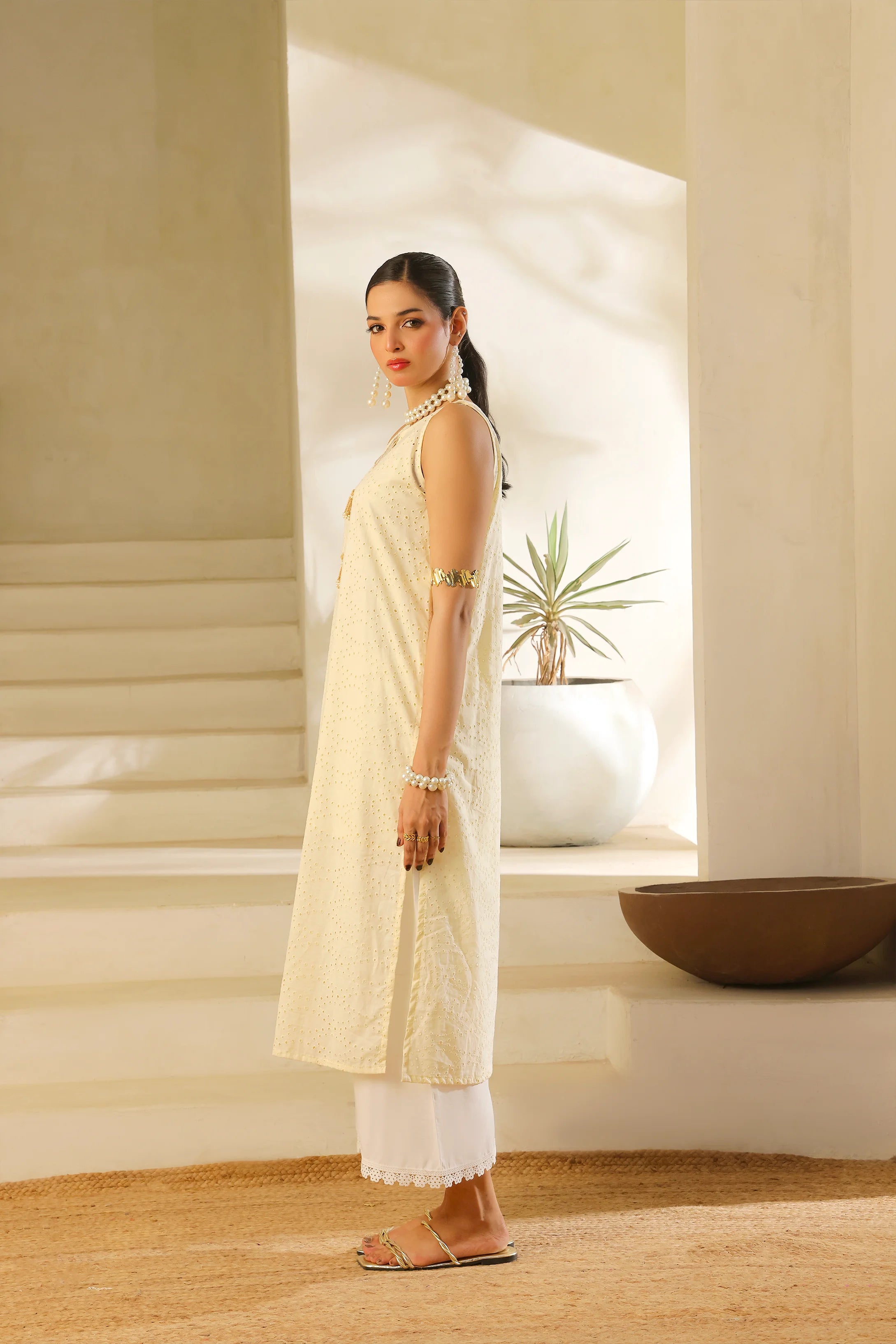 Delicate yet distinctive, this sleeveless Cream Cotton Chicken shirt features subtle tassel accents along the button patti, offering a fresh take on minimalist elegance. Its breezy silhouette and graceful detailing make it a timeless piece—effortlessly merging relaxed charm with refined style.